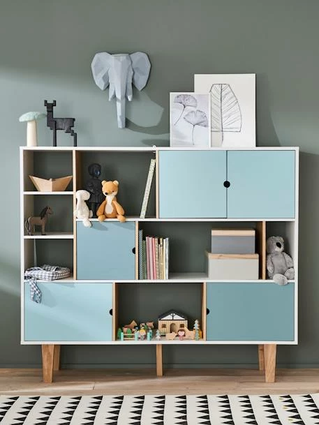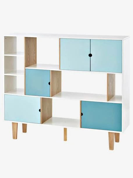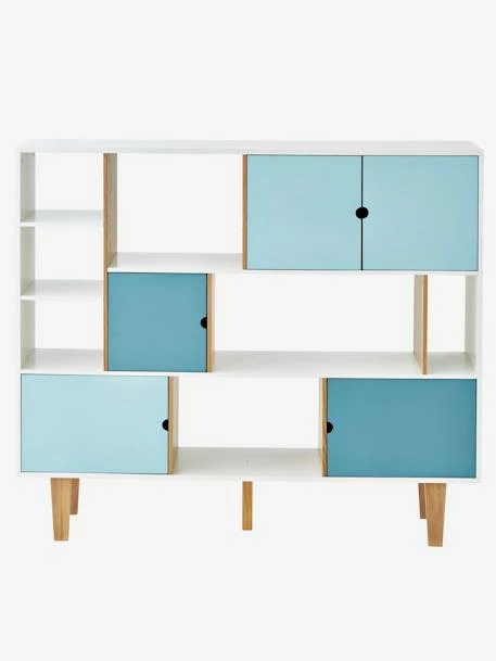 Un design inspiré des pays scandinaves et un camaieu de bleus tendres ; ce meuble de rangement a vraiment tout pour plaire ! D’un côté, la déco se montre grâce aux niches ouvertes, de l’autre, les petites affaires se cachent derrière les placards !