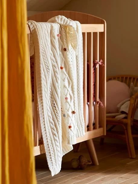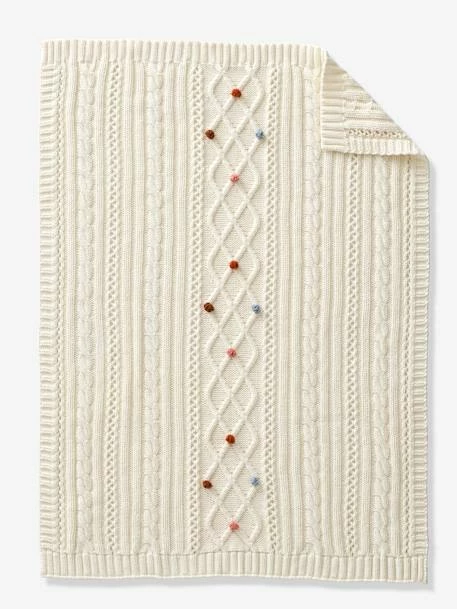 Une jolie couverture en tricot à garder à la maison ou à emporter partout pour réchauffer bébé lors de vos sorties ! De petits pompons viennent animer cette couverture par petites touches colorées.