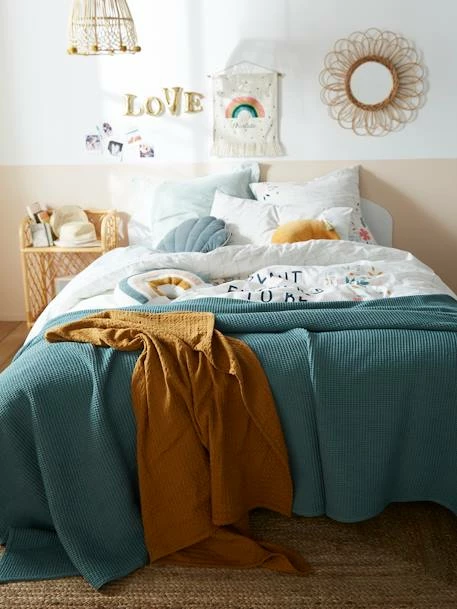 Ce couvre-lit réalisé avec une belle matière nid d’abeille ajoute une douce chaleur supplémentaire et habille avec tendresse la chambre des enfants. Ses belles couleurs et son aspect moelleux apportent la touche finale à la déco de chambre !
