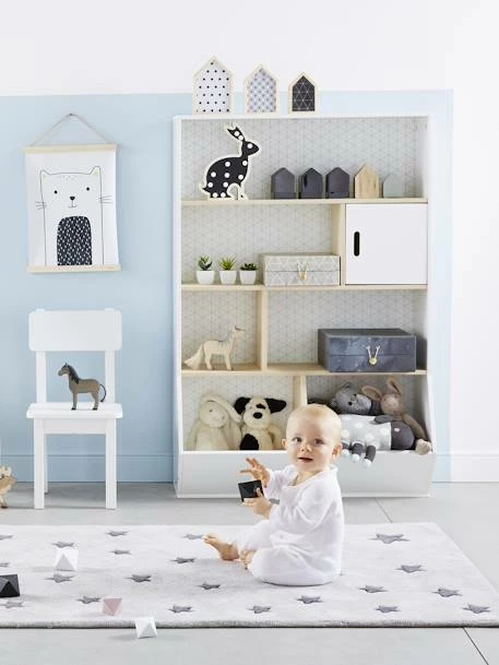 Bien pensée et très jolie, cette étagère a tout pour plaire… et surtout de nombreux rangements. Astucieux, les bacs du bas où les enfants pourront y “jeter” peluches et jouets et ranger sans y penser !