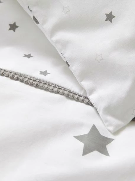 - Parement motifs étoiles bordé par un ruban pompons sur le haut de la couette