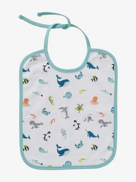- Imprimé sur fond blanc, différent sur chaque bavoir : baleine, crabe, loutre, manchot, otarie, poulpe + un reprenant tous ces motifs