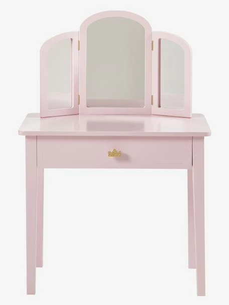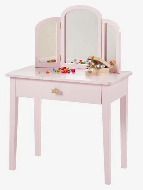 Pour votre petite princesse en devenir, voici la coiffeuse rêvée de toutes les petites filles ! Toute rose, avec un miroir triptyque pour se pomponner, un grand tiroir pour garder les secrets et une poignée en forme de couronne pailletée… On en connait une qui va faire des jalouses !