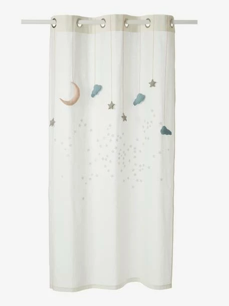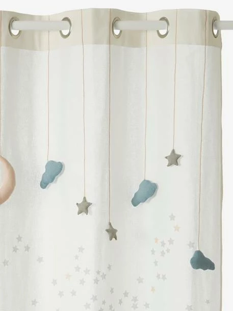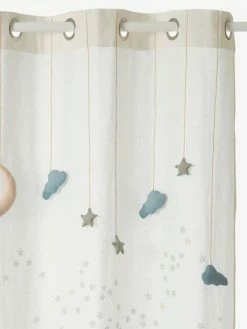 Suspendue à de petits fils, la lune, accompagnée de nuages et d’étoiles roses et gris décorent avec poésie ce joli rideau tamisant !