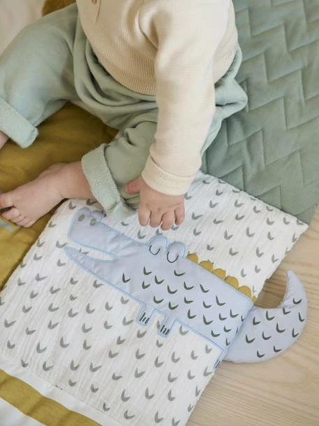 - 1 face patchwork en gaze, jersey et percale de coton. Applications, queue de croco en volume, broderie, matelassage zig zag, encre gonflante
