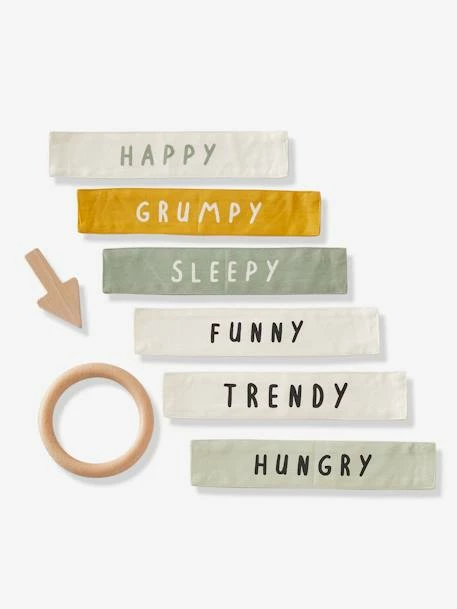 - Livré avec un anneau en bois, une flèche en bois et 6 étiquettes textiles à scratcher
