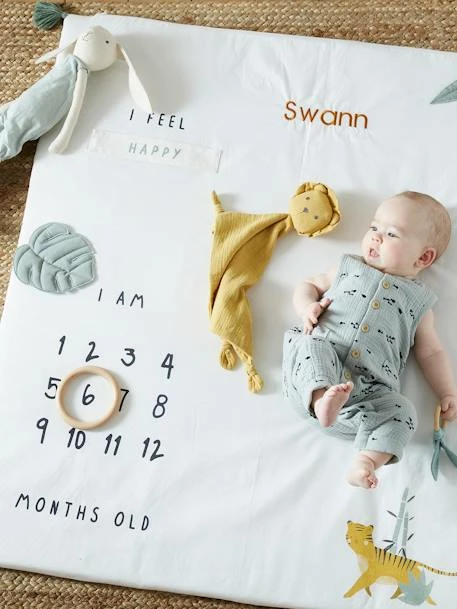 Hello joli baby ! Photographiez la croissance de bébé mois après mois avec ce joli tapis de sol ! Le petit + : il se personnalise ! Un anneau pour entourer l’âge, une flèche pour indiquer la taille et 6 étiquettes textiles avec des adjectifs pour finaliser vos photos et créer de super souvenirs !
